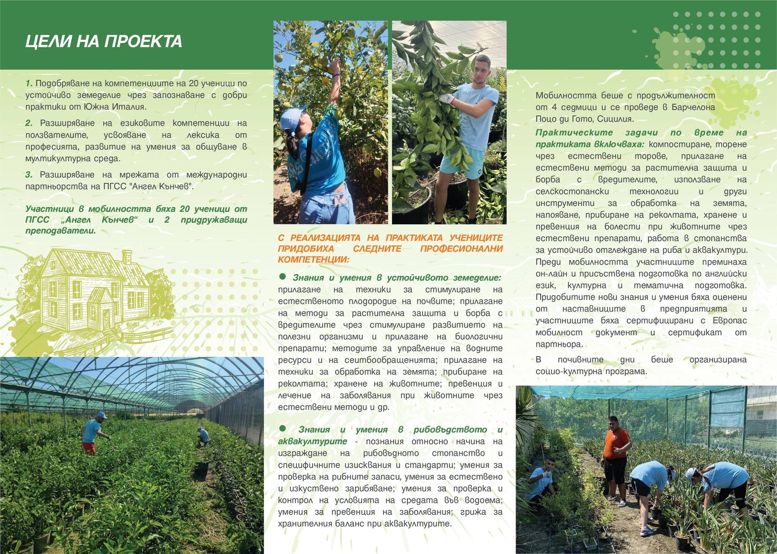 Следващата потребност е учениците да разширят своите езикови компетенции, да придобият умения за общуване в мултикултурна среда, да развият социалните си умения, да станат по-гъвкави и адаптивни, което е важно в съвременните условия на мобилност на пазара на труда. Международната дейност на училището също има нужда да се доразвива, а партньорската мрежа - да се разширява. Основните дейности са: подбор на 20 ползватели; предварителна тематична, езикова и културна подготовка; организация на пътуването; провеждане на 4-седмична практика на 20 ученици в Италия във ферми от секторите на устойчивото земеделие, рибарство и аквакултури; оценка и сертифициране на участниците, реализиране на дейности за интегриране и разпространение на резултатите. Практическите задачи по време на практиката включват компостиране, торене чрез естествени торове, прилагане на естествени методи за растителна защита и борба с вредителите, използване на селскостопански технологии и други инструменти за обработка на земята, напояване, прибиране на реколтата, хранене и превенция на болести при животните чрез естествени препарати, работа в стопанства за устойчиво отглеждане на риба и аквакултури.